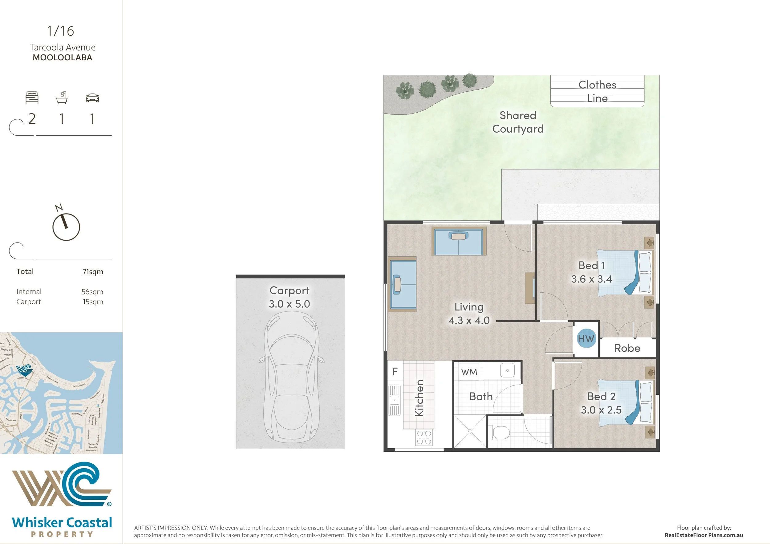 2 bedrooms, 1 bathroom, 1 car accommodation