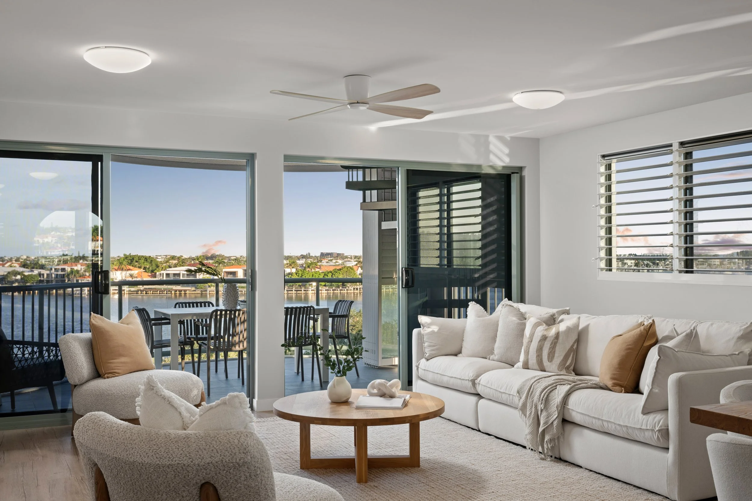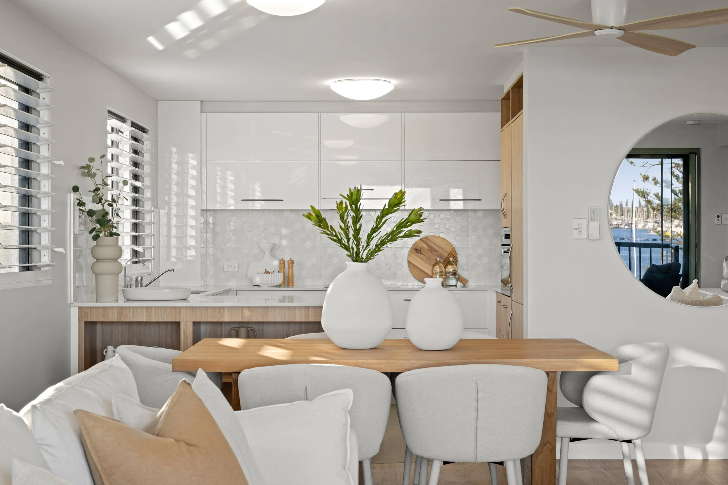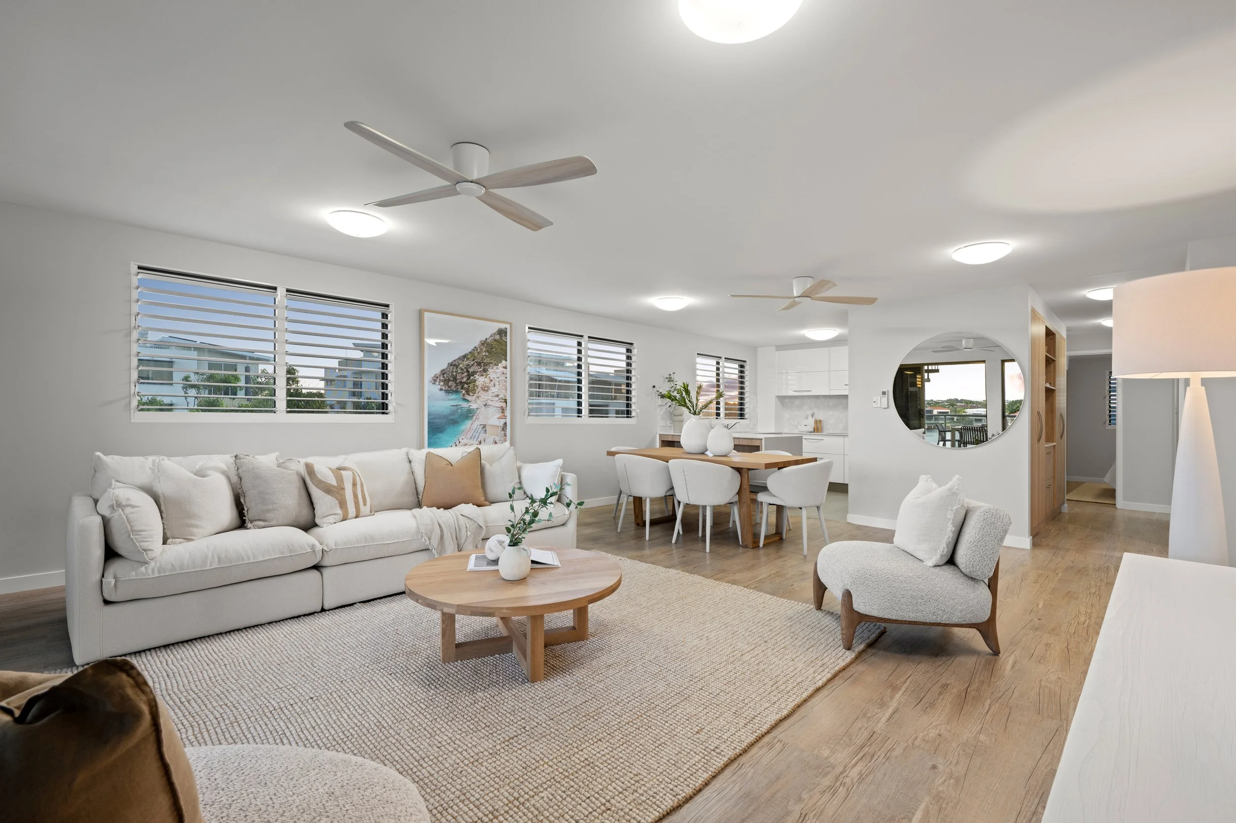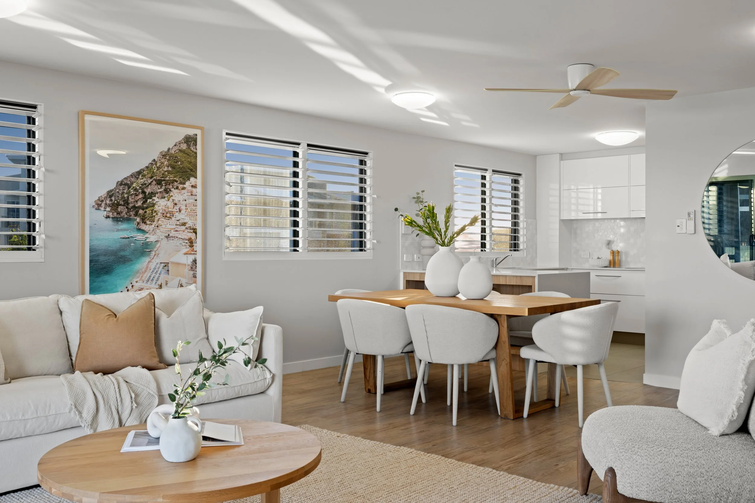 Inside, the apartment offers a well-considered layout with 3 bedrooms, 2.5 bathrooms, a separate laundry, 2 car spaces and a storage cage, making it an outstanding option for both permanent living and holiday-style enjoyment. The interiors have a fresh coastal feel, complemented by low-maintenance flooring, air conditioning and ceiling fans throughout for year-round comfort. The elevated position and end aspect allow natural light to pour through the apartment, creating a bright and welcoming atmosphere across the entire apartment.