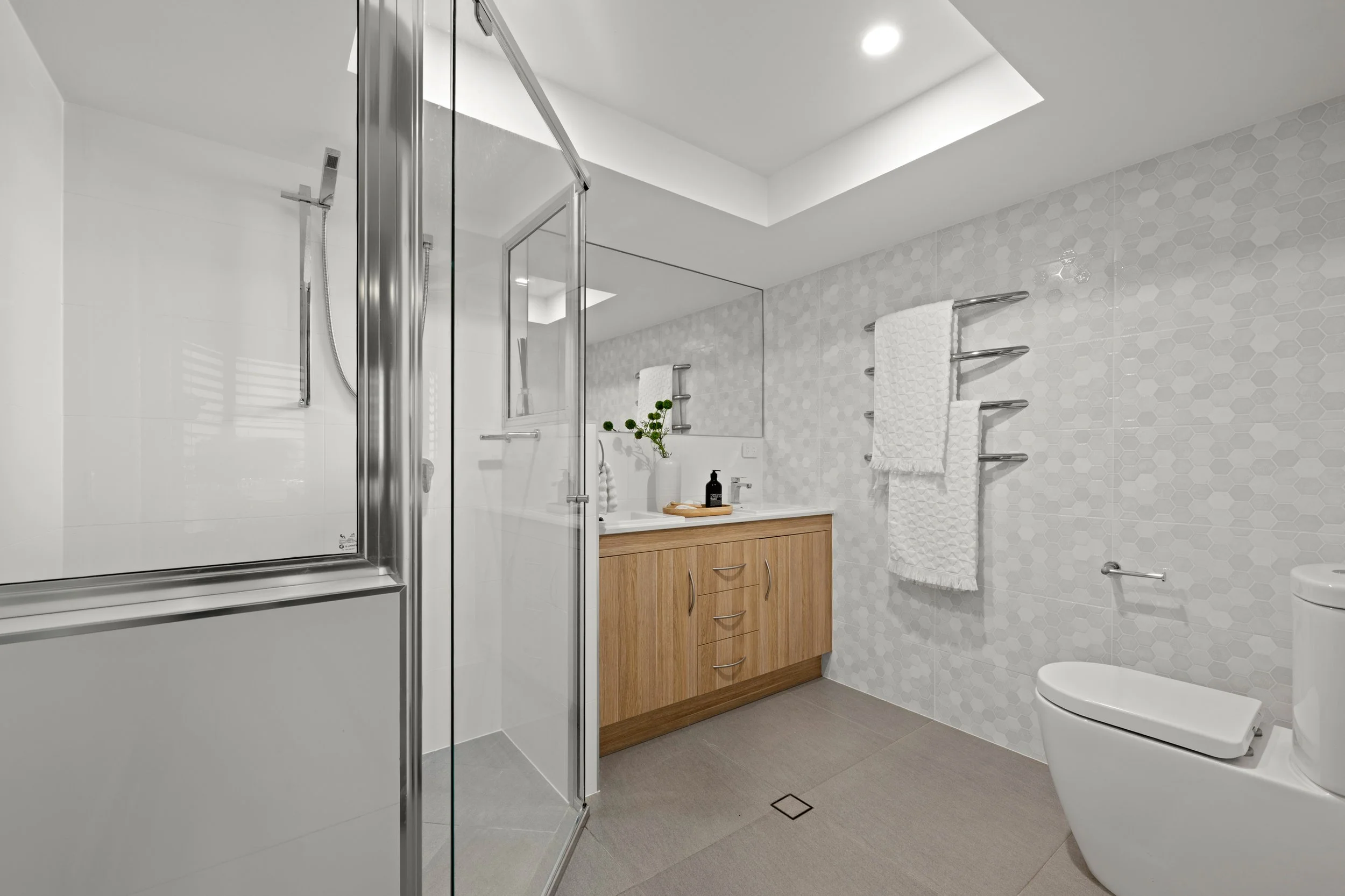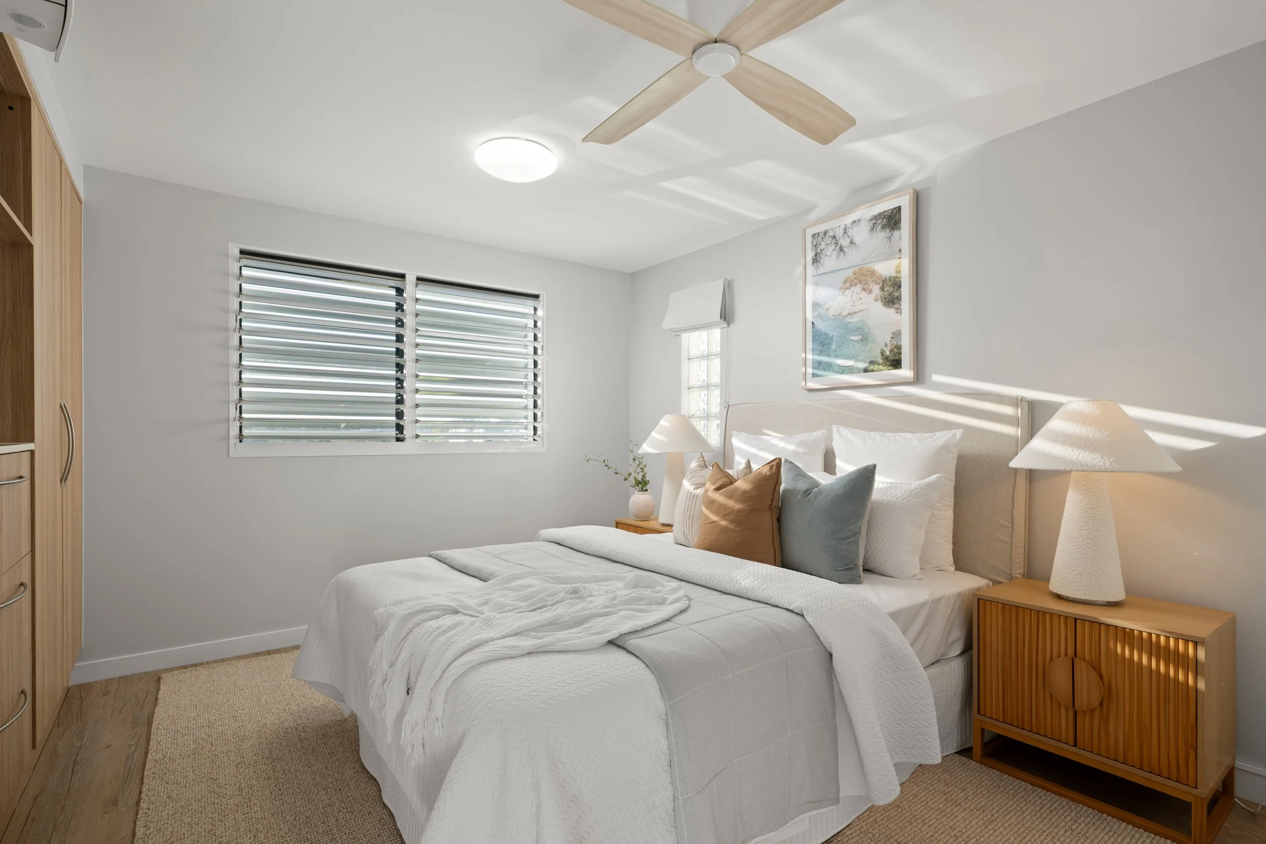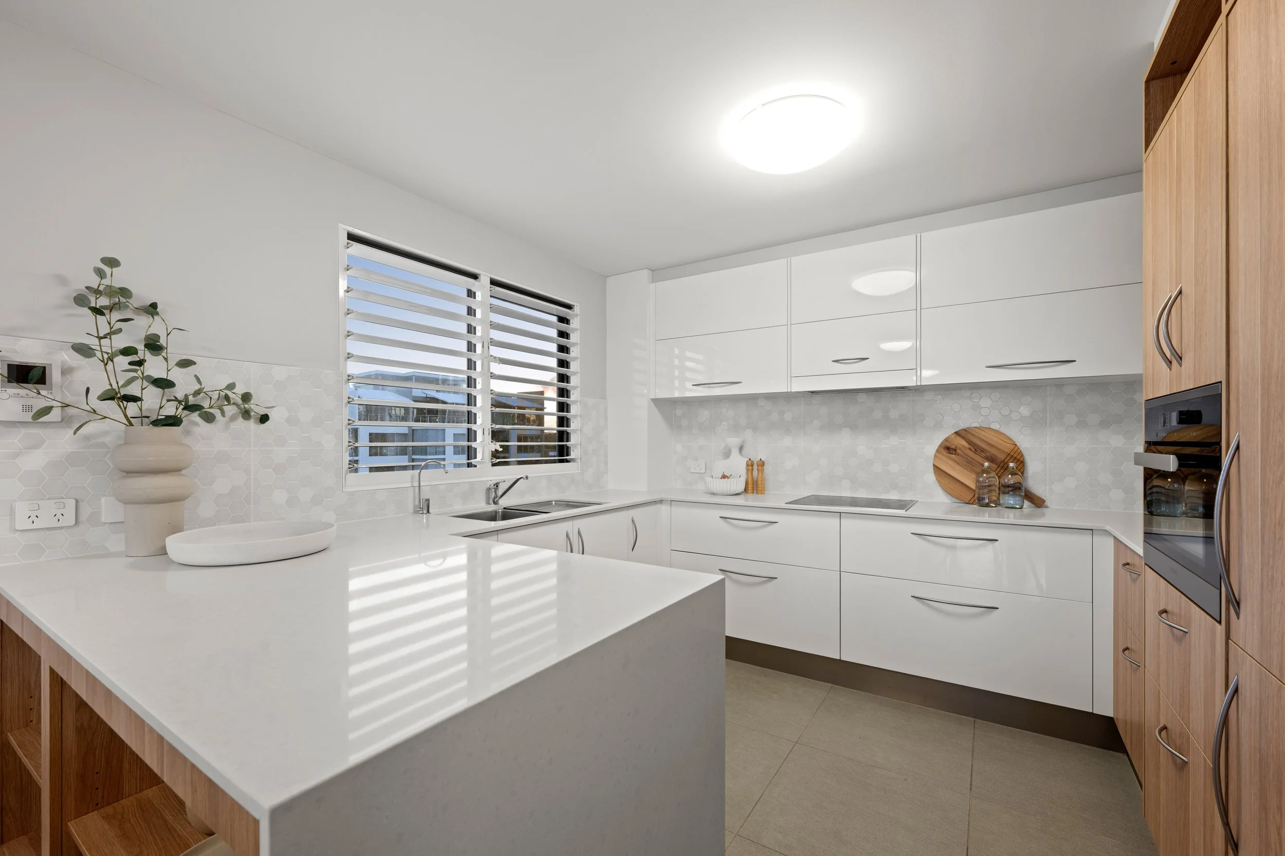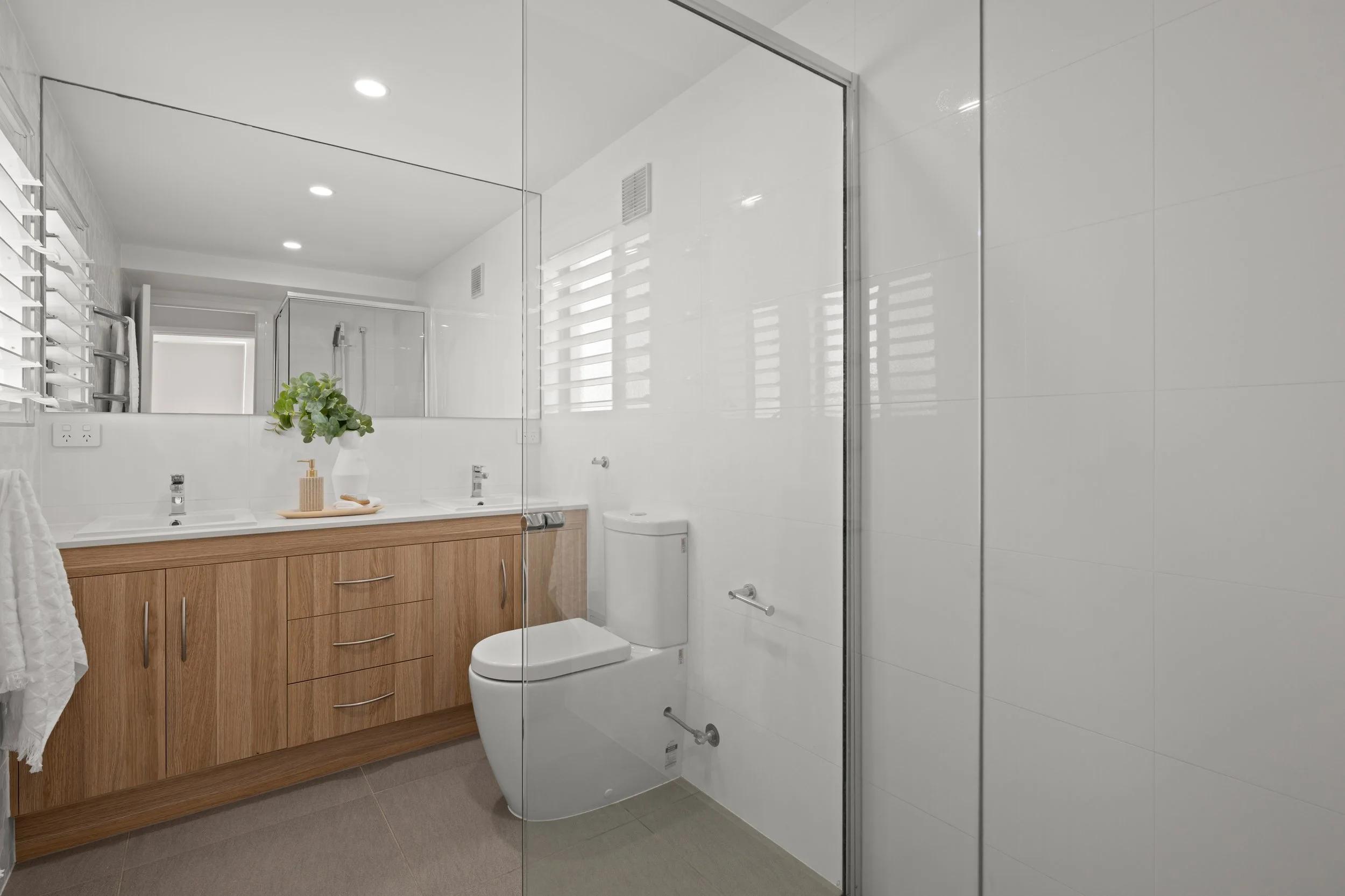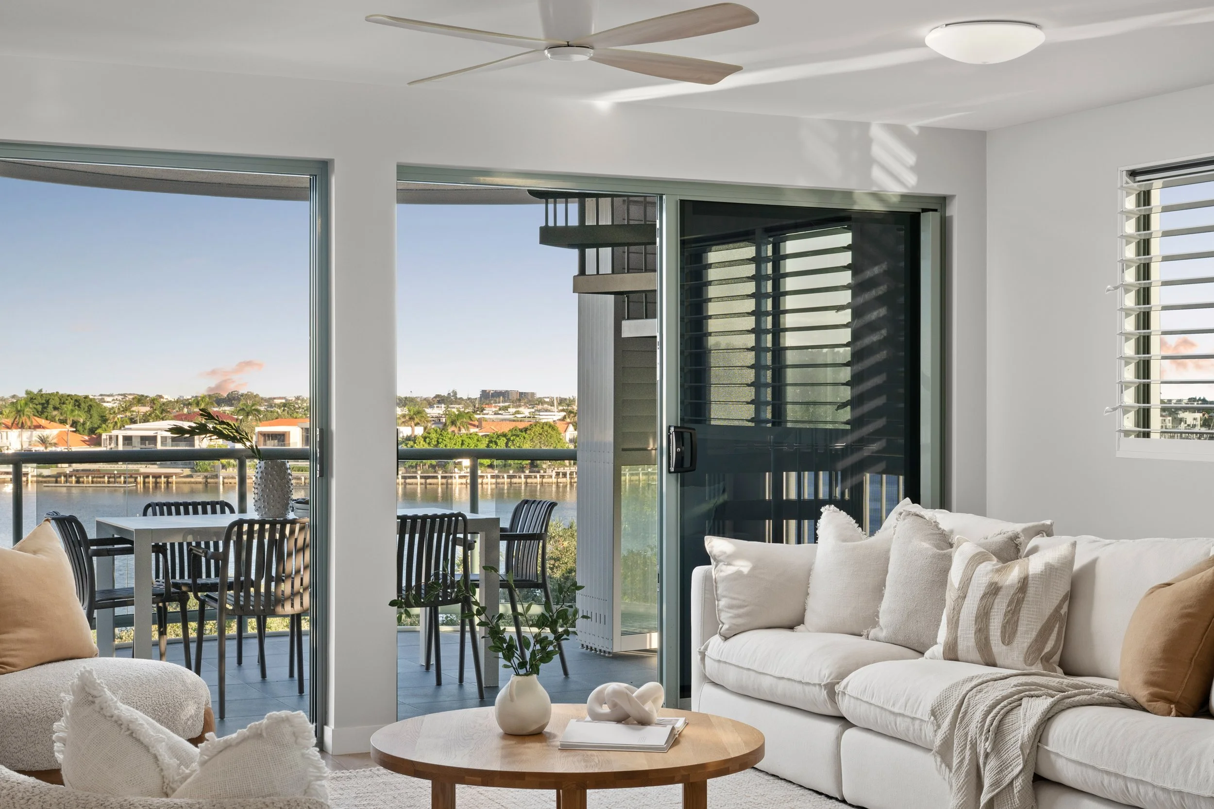 Inside, the apartment offers a well-considered layout with 3 bedrooms, 2.5 bathrooms, a separate laundry, 2 car spaces and a storage cage, making it an outstanding option for both permanent living and holiday-style enjoyment. The interiors have a fresh coastal feel, complemented by low-maintenance flooring, air conditioning and ceiling fans throughout for year-round comfort. The elevated position and end aspect allow natural light to pour through the apartment, creating a bright and welcoming atmosphere across the entire apartment.