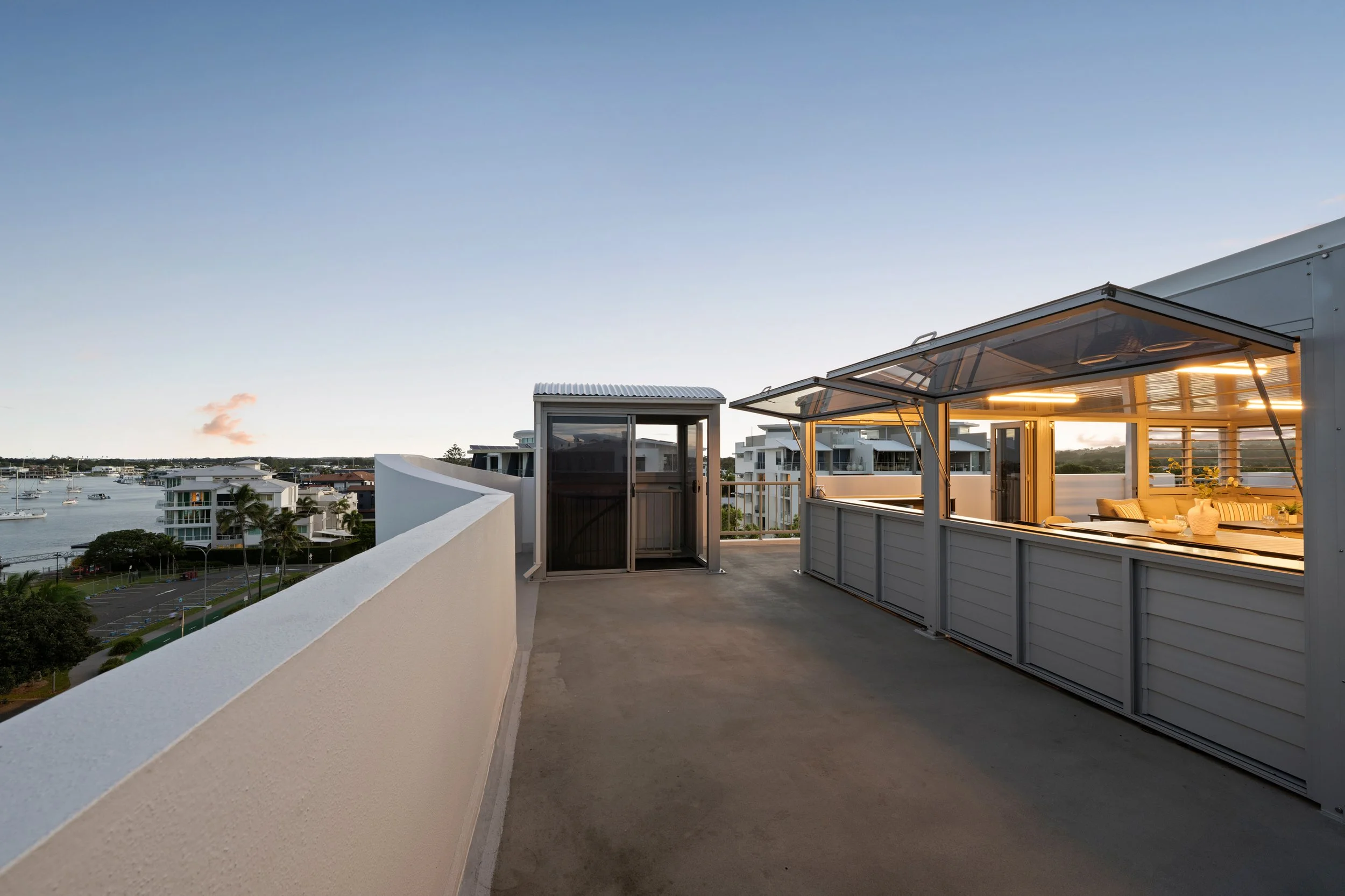 A true highlight of the property is the private rooftop terrace, accessed internally from the apartment itself. Thoughtfully improved by the current owners, this space features a built-in entertaining pavilion where you can host family and friends while soaking in views over the Mooloolah River and out toward Mooloolaba beach. It is the kind of feature that elevates the entire property, offering a unique extension of the living space and a private place to enjoy the coastal lifestyle from above.