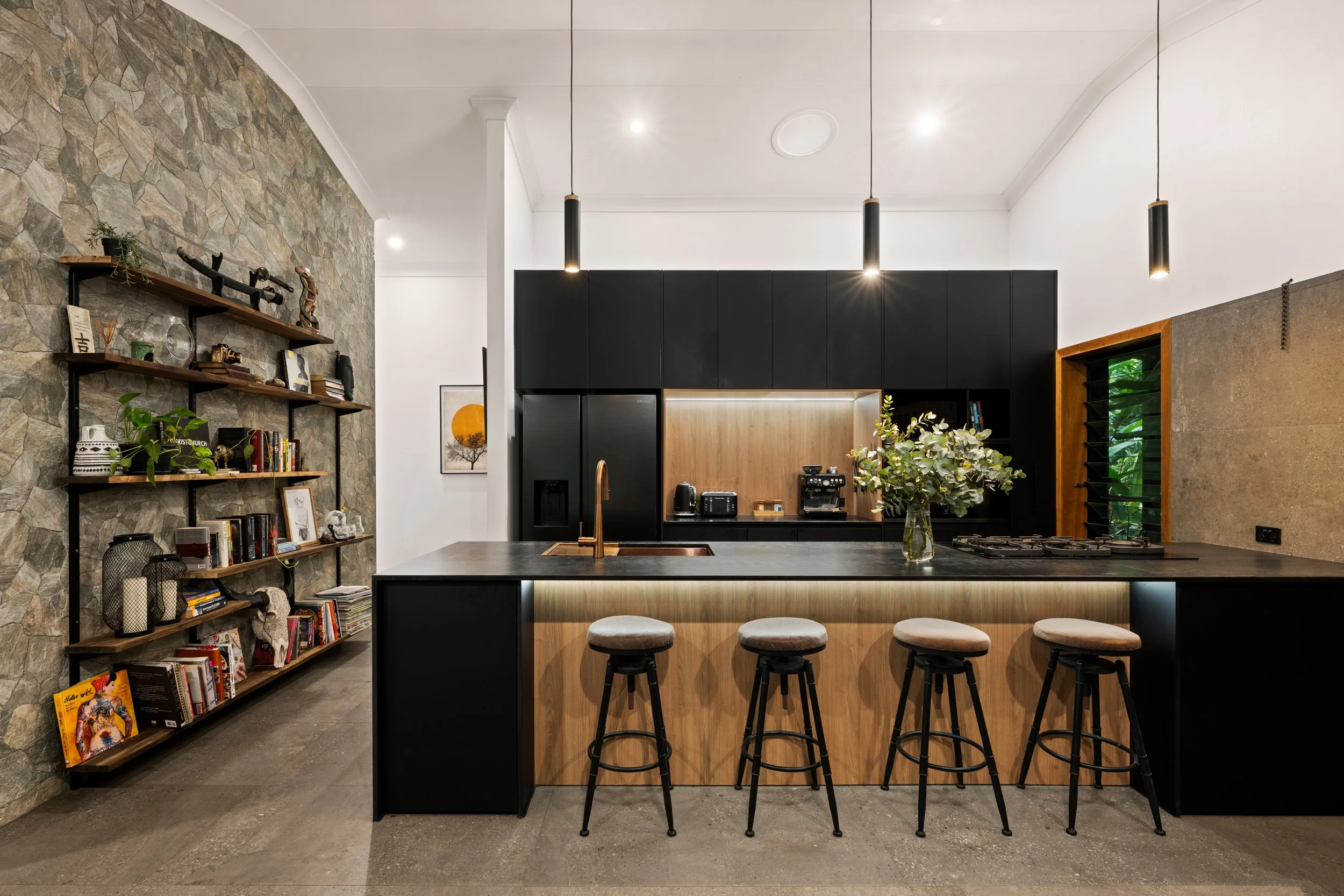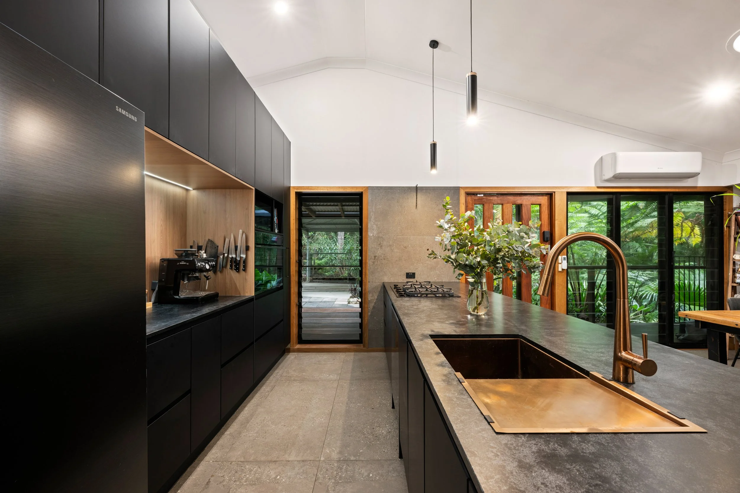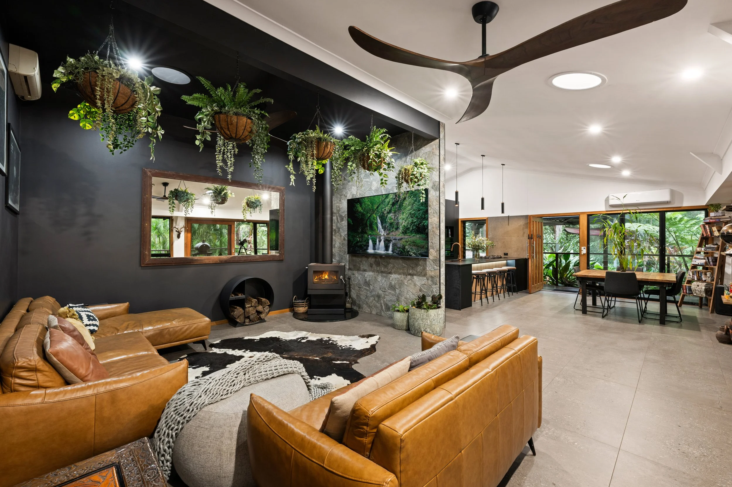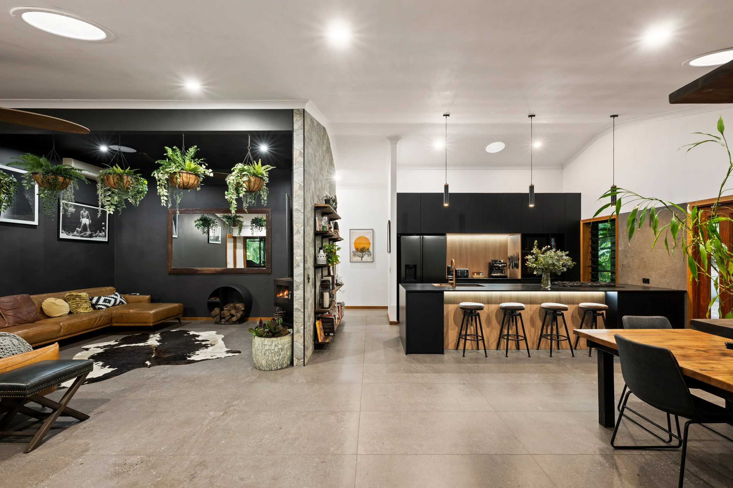 The kitchen, newly completed in 2024, is both striking and functional, featuring top-end appliances, gas cooking and generous workspace, making it the true heart of the home. Large-format 1200 x 600 tiles anchor the main living areas, while ceiling fans throughout, air-conditioned living, and a cosy log fire ensure year-round comfort. Every space has been thoughtfully considered, blending contemporary finishes with warmth and texture.