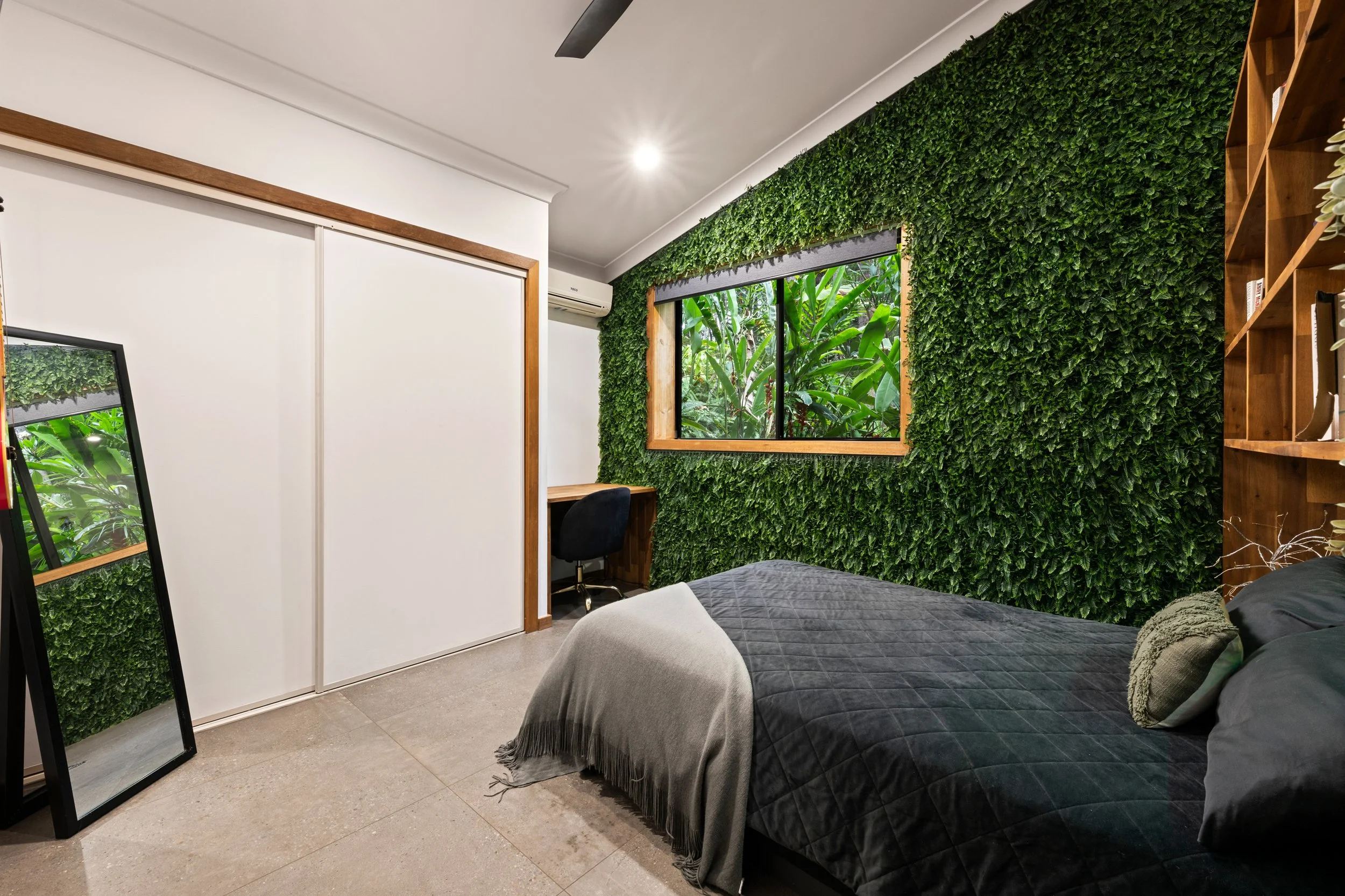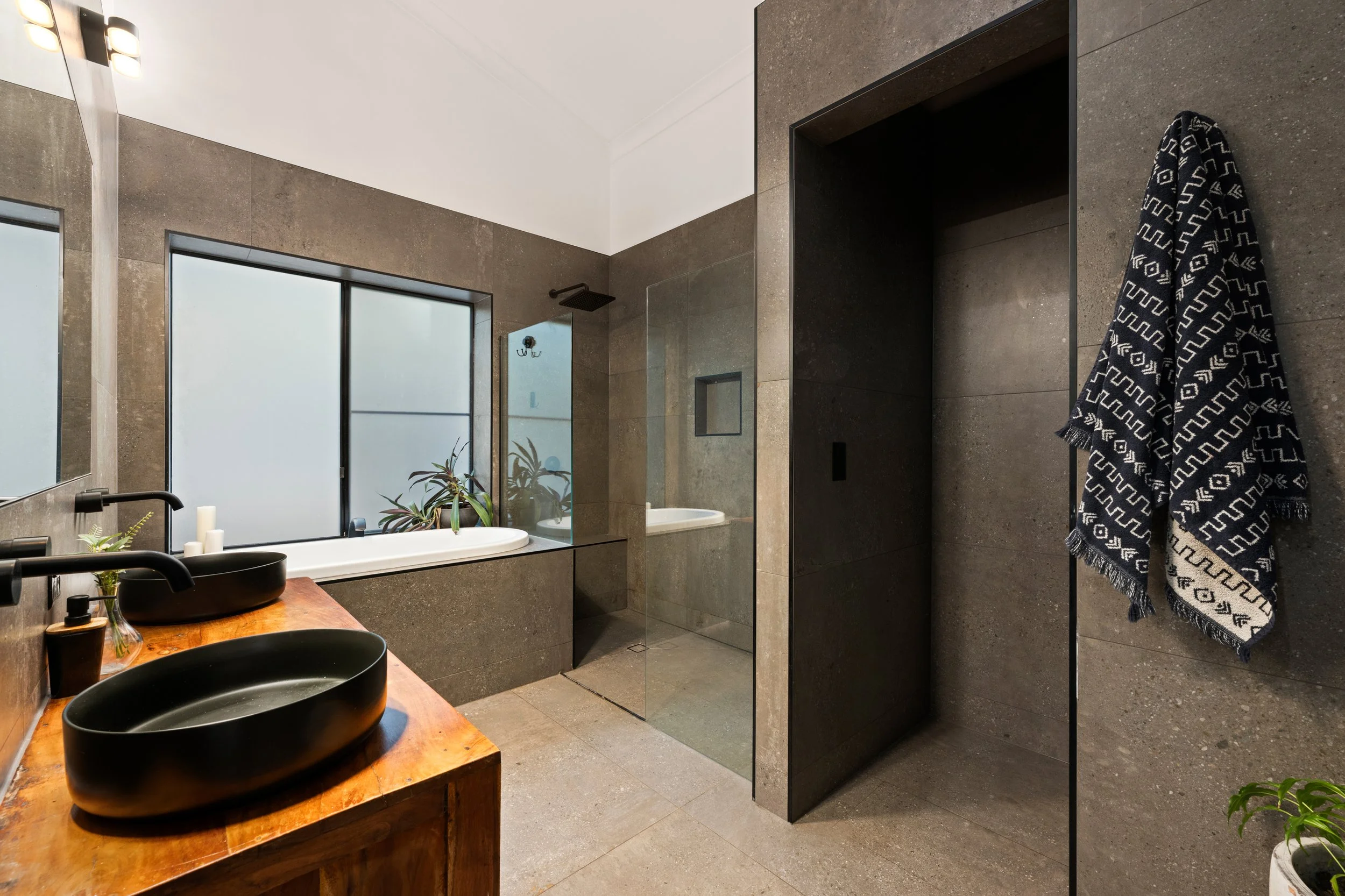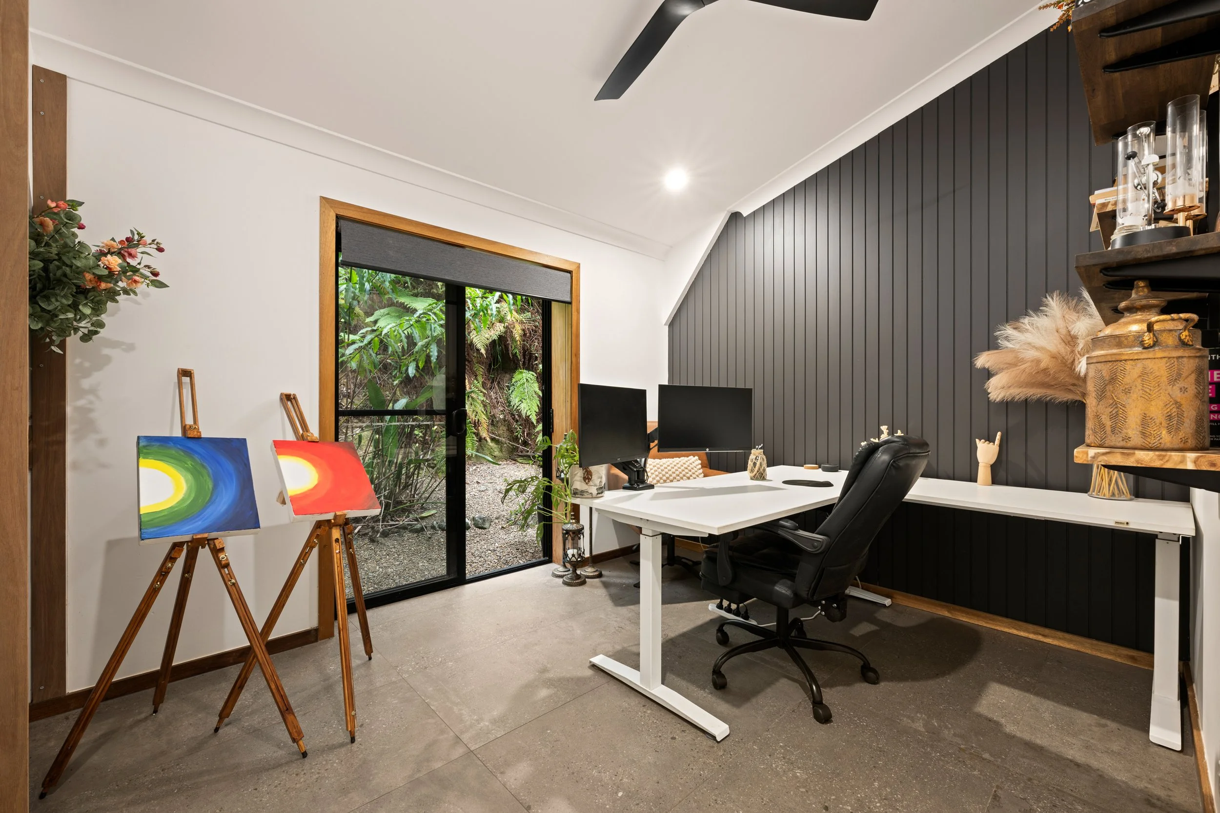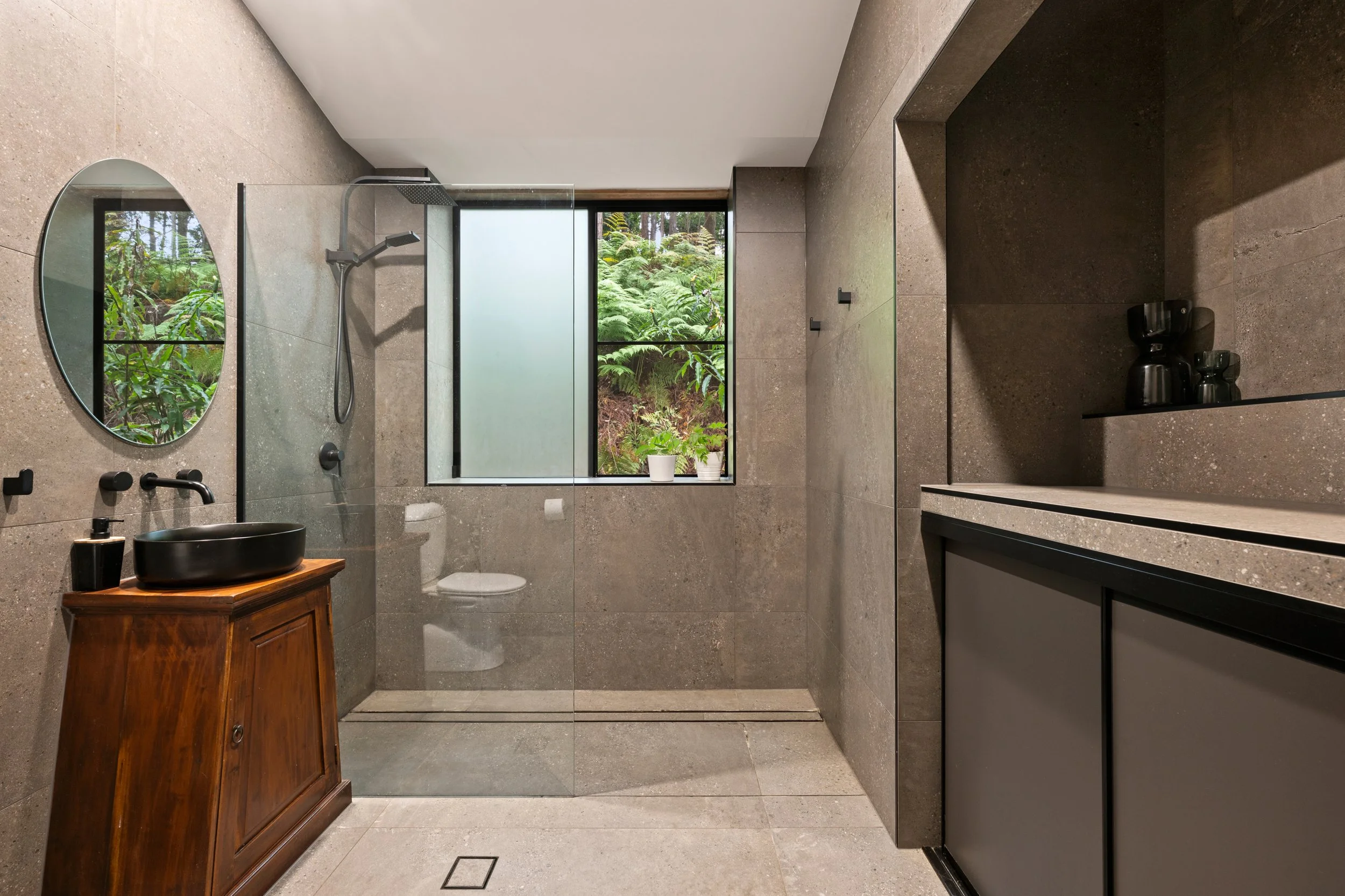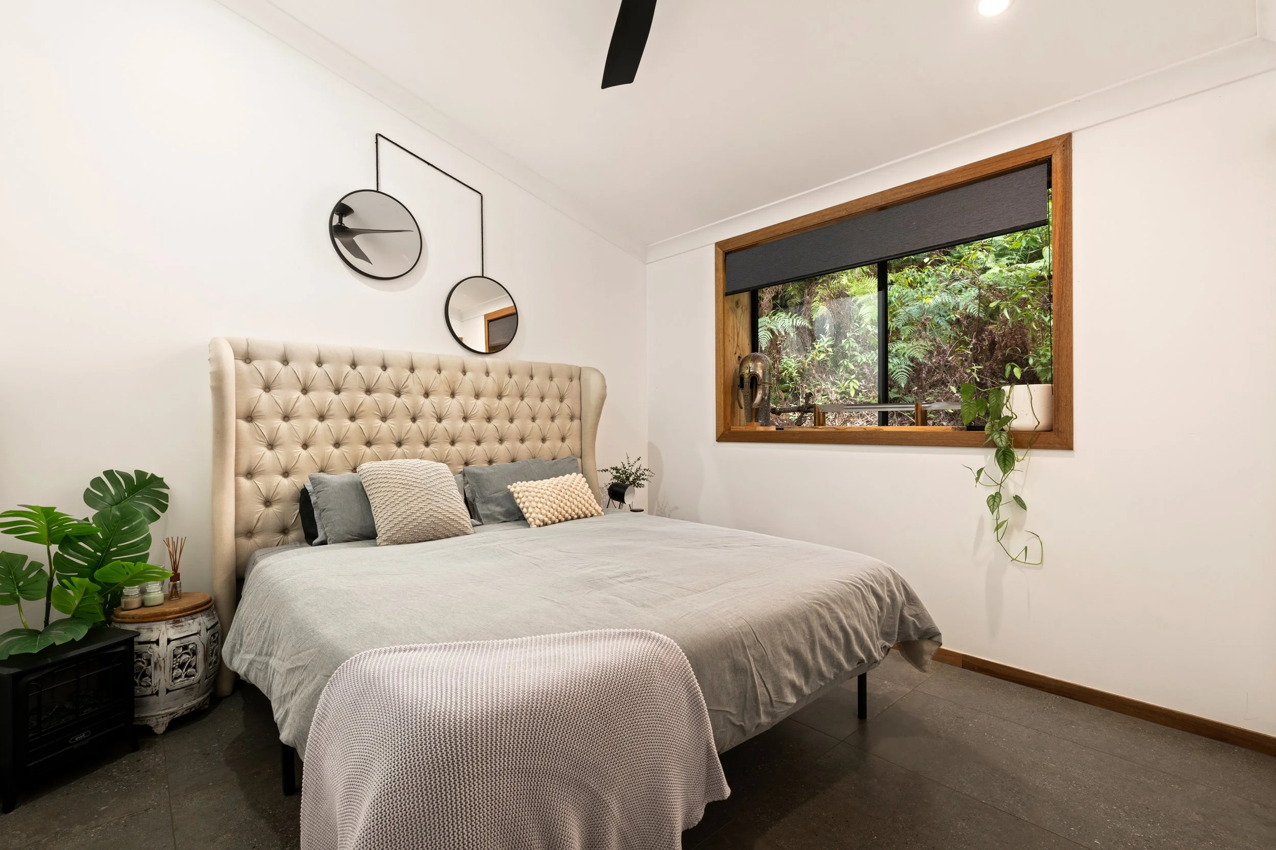 The kitchen, newly completed in 2024, is both striking and functional, featuring top-end appliances, gas cooking and generous workspace, making it the true heart of the home. Large-format 1200 x 600 tiles anchor the main living areas, while ceiling fans throughout, air-conditioned living, and a cosy log fire ensure year-round comfort. Every space has been thoughtfully considered, blending contemporary finishes with warmth and texture.