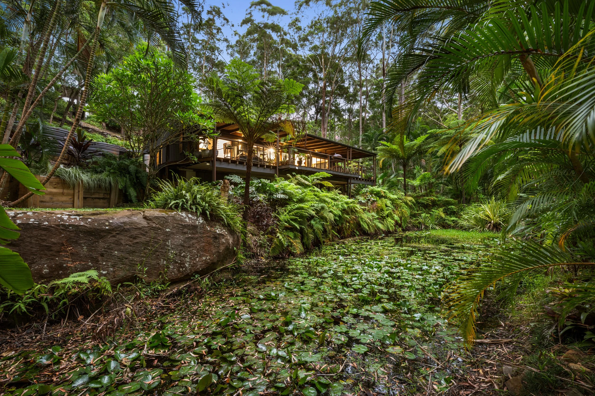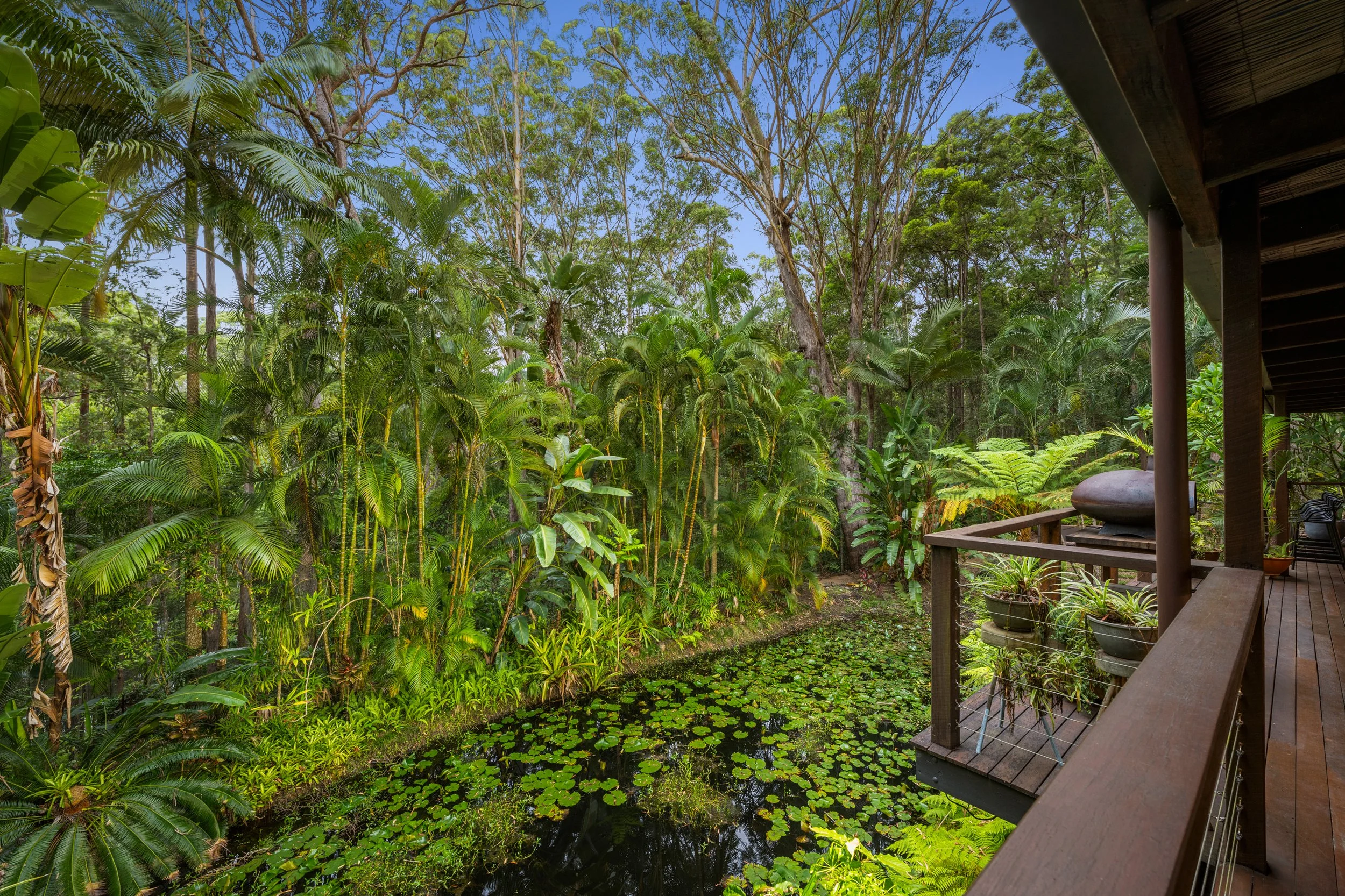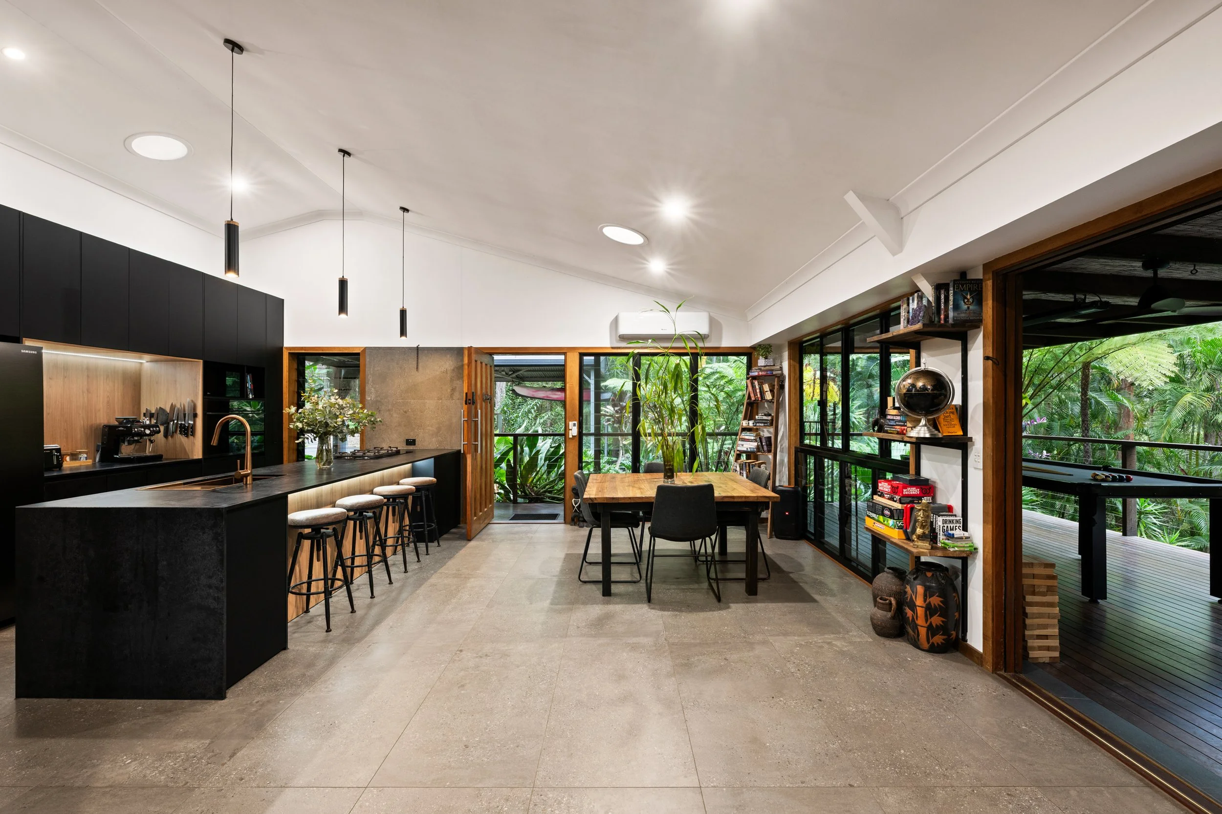 Designed to embrace its outlook, the home unfolds across 263m² and is framed by tropical landscaping, floodlit trees and a serene pond dotted with lily pads. A wraparound verandah draws you outdoors and invites slow mornings and long evenings overlooking the water, while the sound of a cascading waterfall adds to the property’s unmistakable Bali-inspired atmosphere. Inside, soaring 3.7-metre ceilings and expansive glazing create an immediate sense of openness, with the kitchen, living and dining zones all enjoying uninterrupted views across the lush greenery beyond.