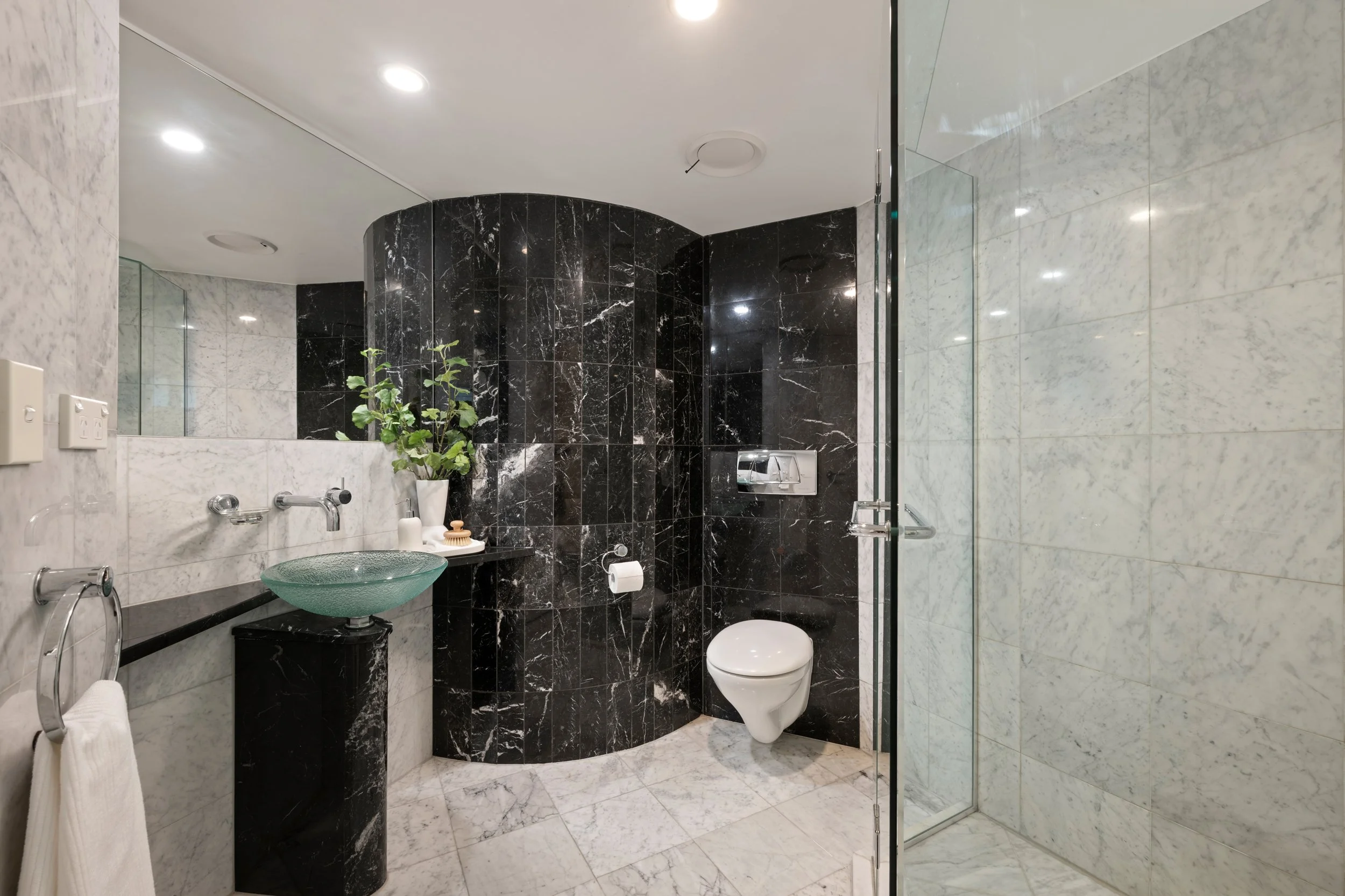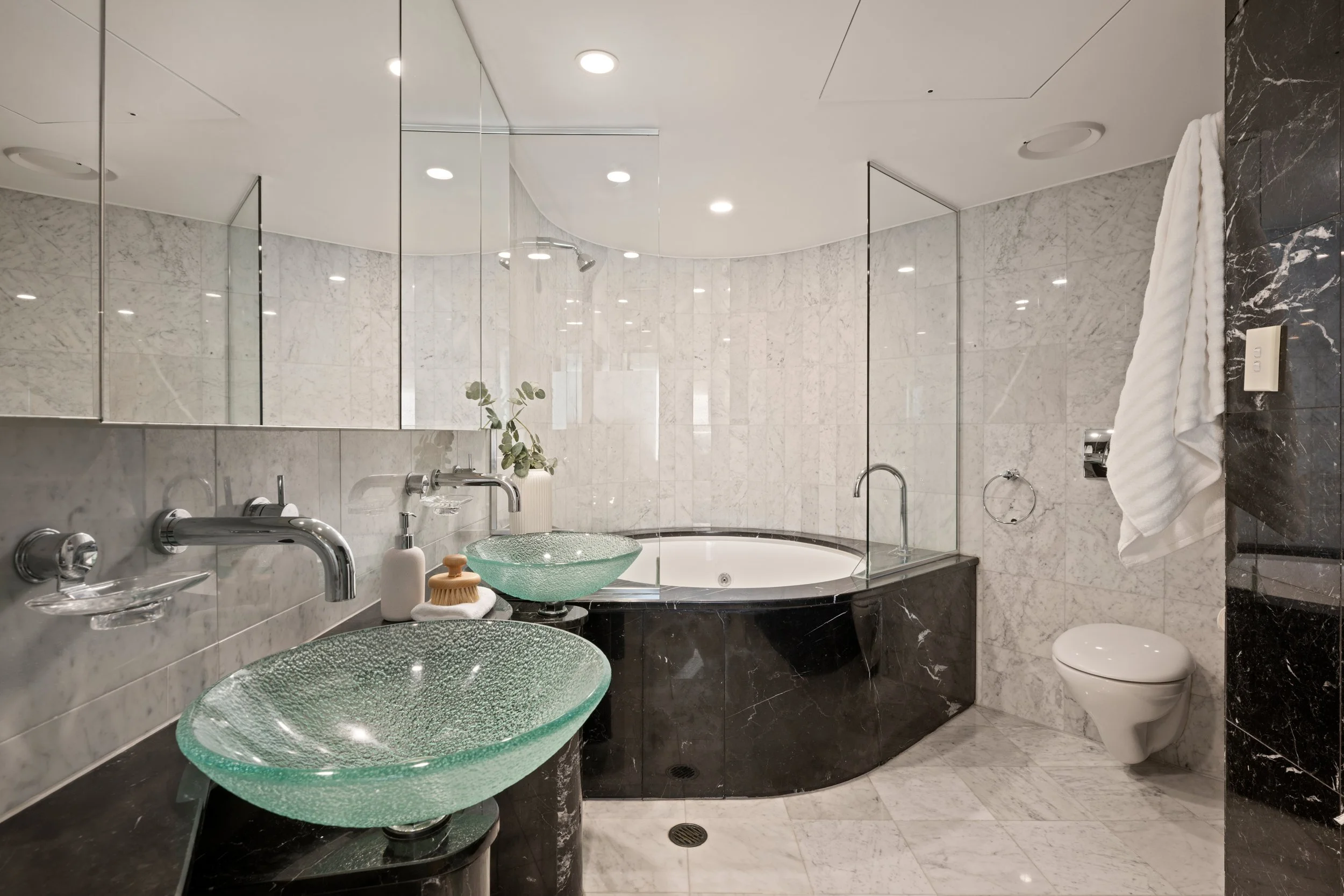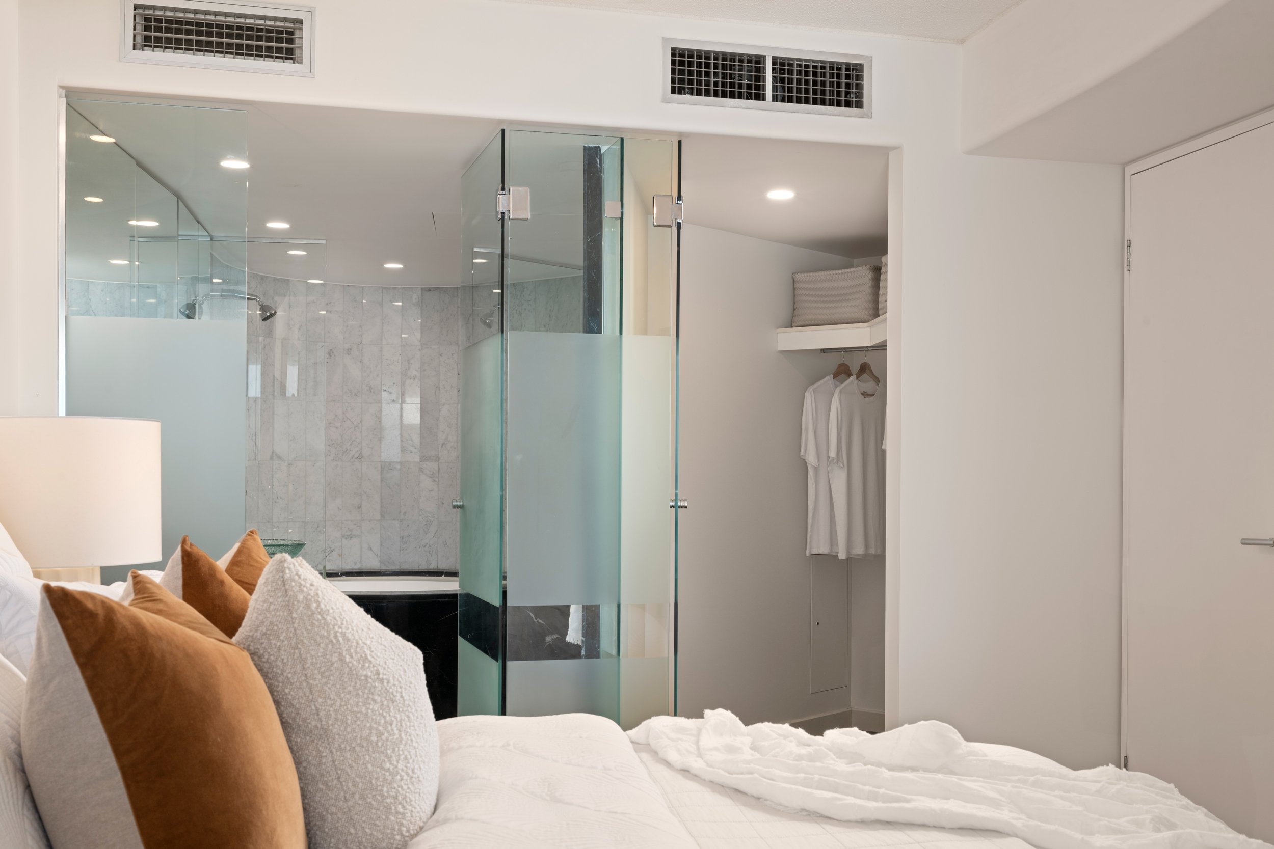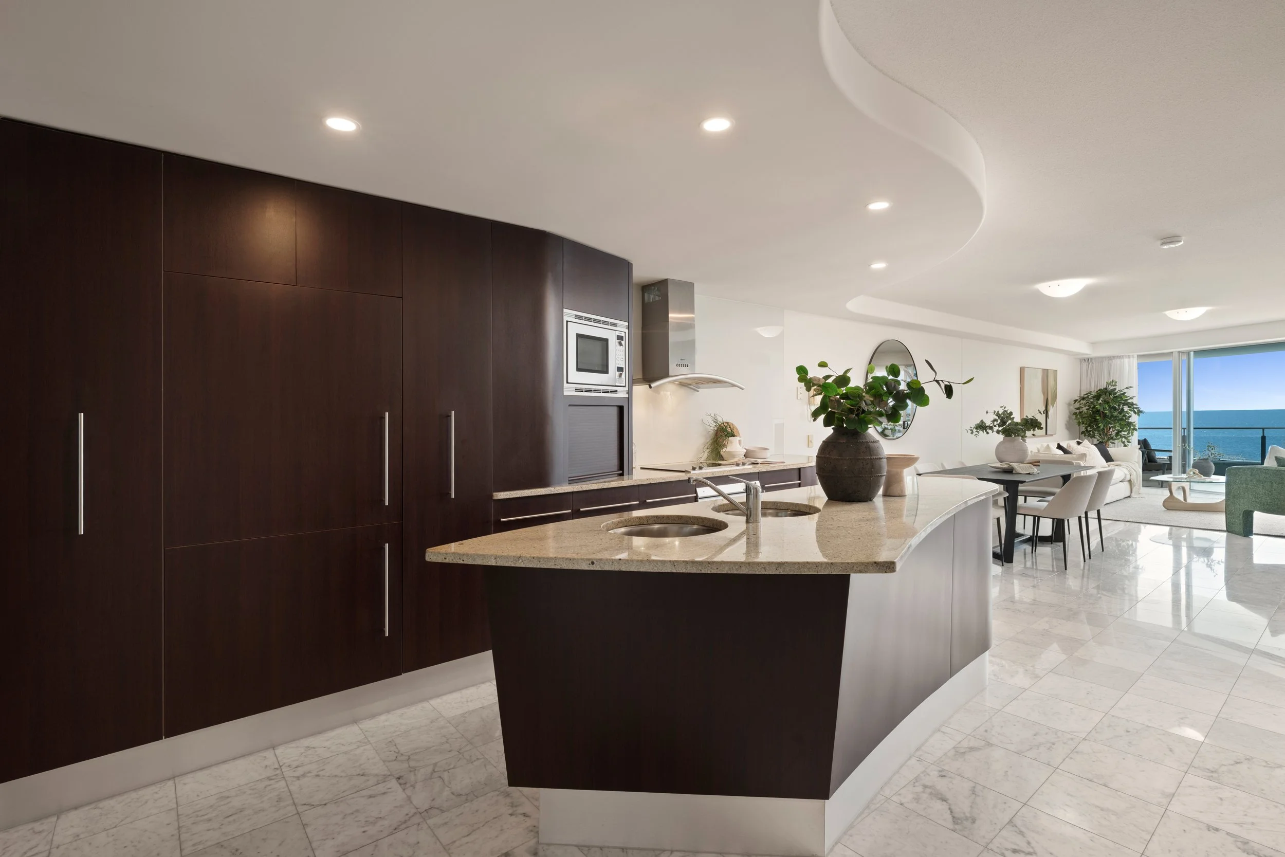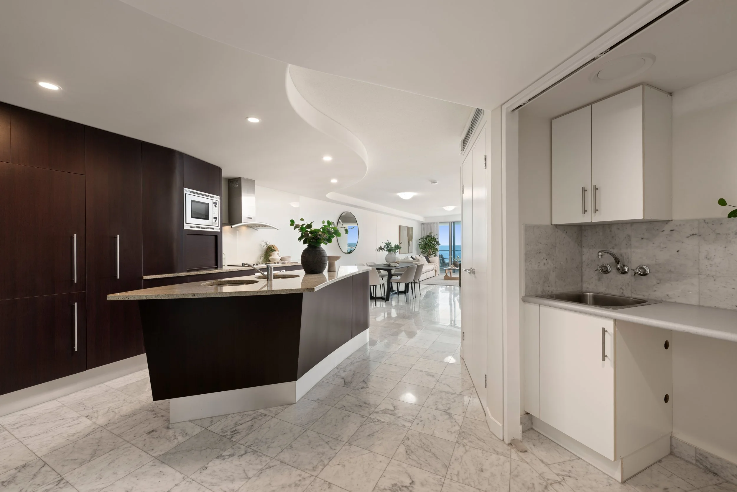 A European laundry adds practicality, while ducted air-conditioning ensures year-round comfort. Throughout the apartment, the marble detailing ties each space together, creating a sense of refinement that feels both coastal and classic.
