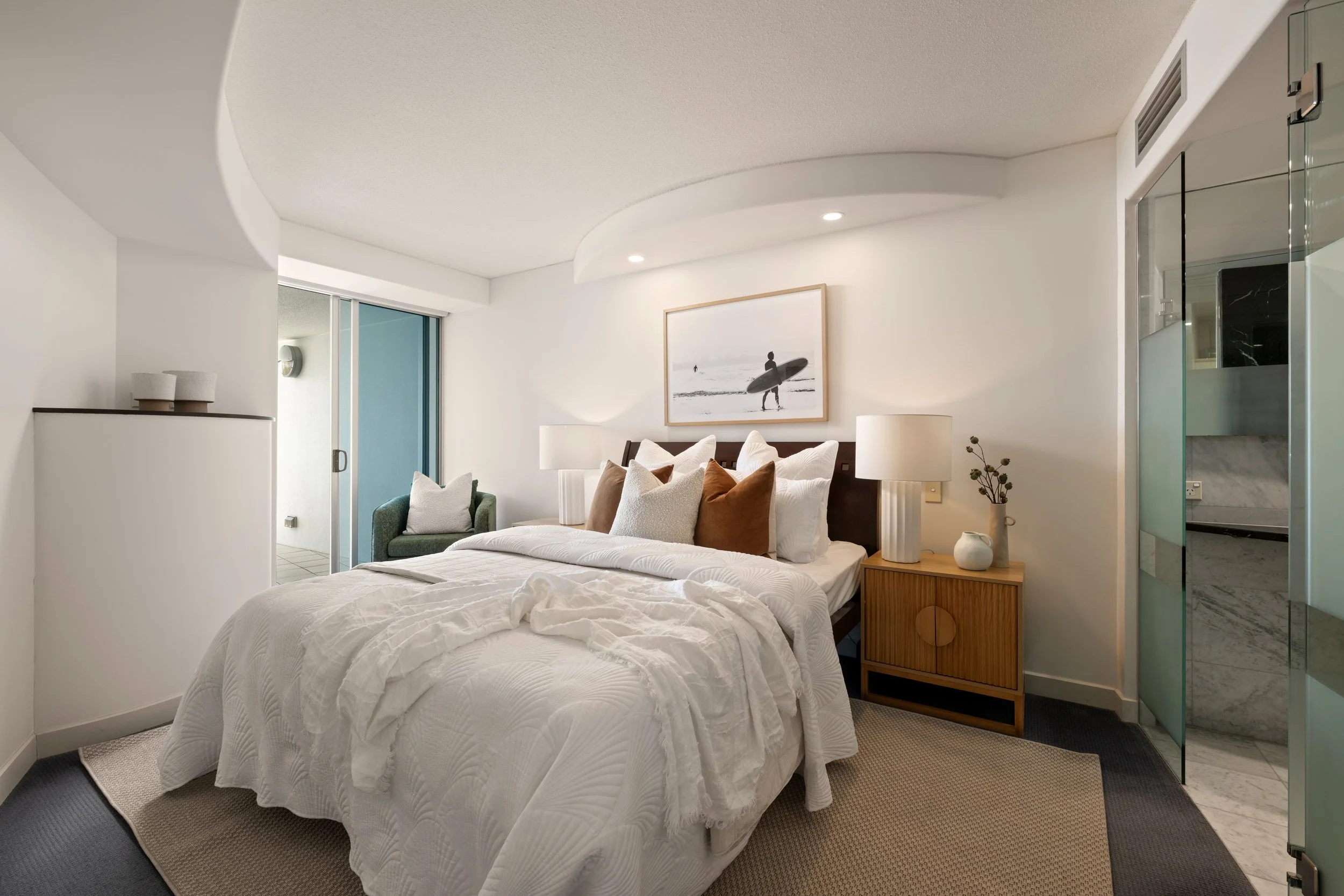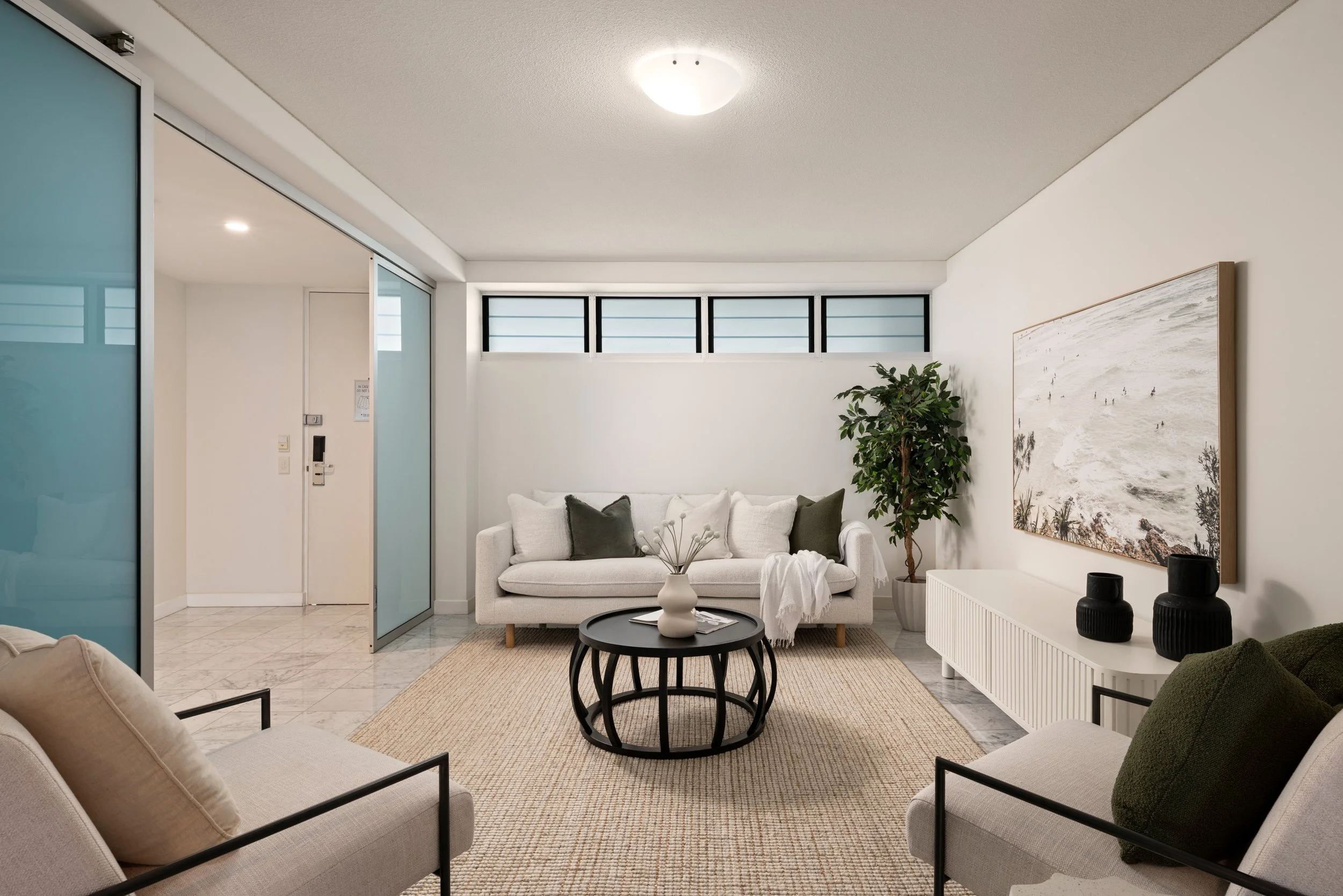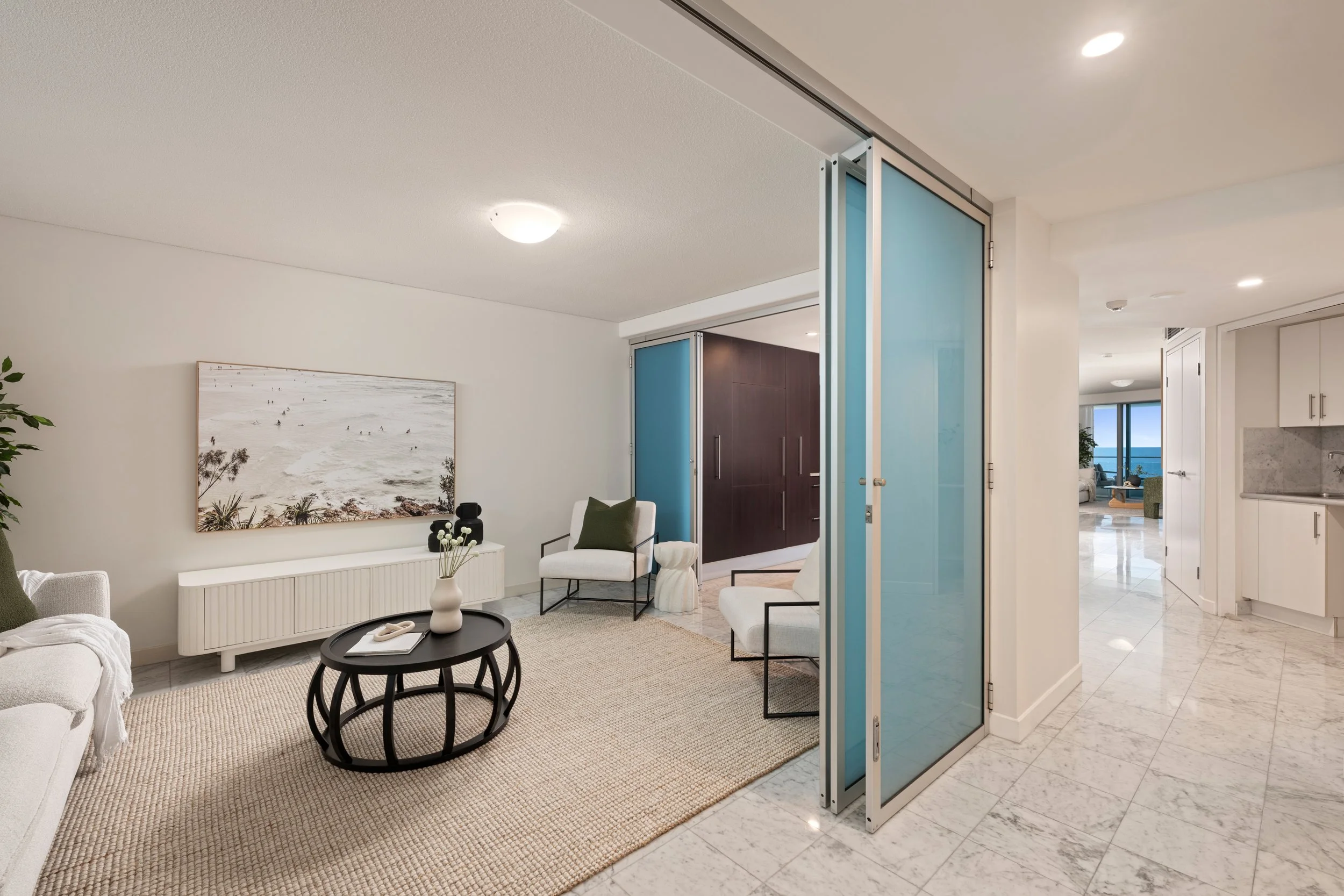 Inside, the main bedroom is a true retreat, positioned to soak in ocean views with direct balcony access. The ensuite is beautifully finished in marble, complete with a spa bath and double vanity, offering an indulgent touch of everyday luxury. The second bedroom is privately located at the rear, serviced by the main bathroom - ideal for guests. What truly sets this residence apart is the flexible second lounge, cleverly designed with sliding doors, easily transforming into a third bedroom or guest suite when needed.