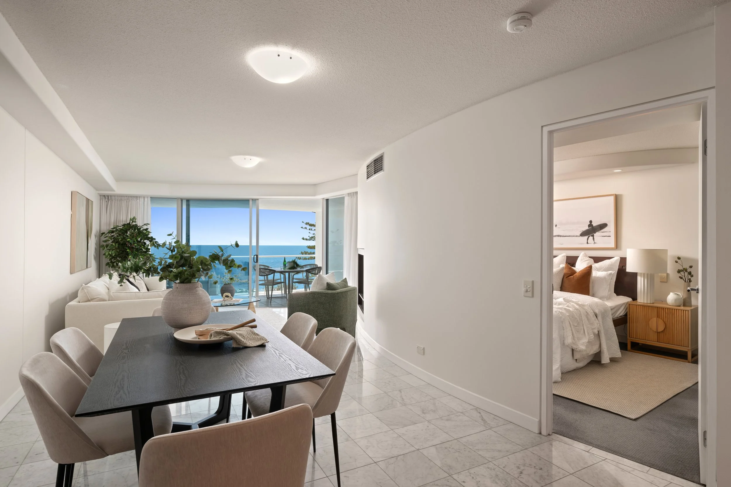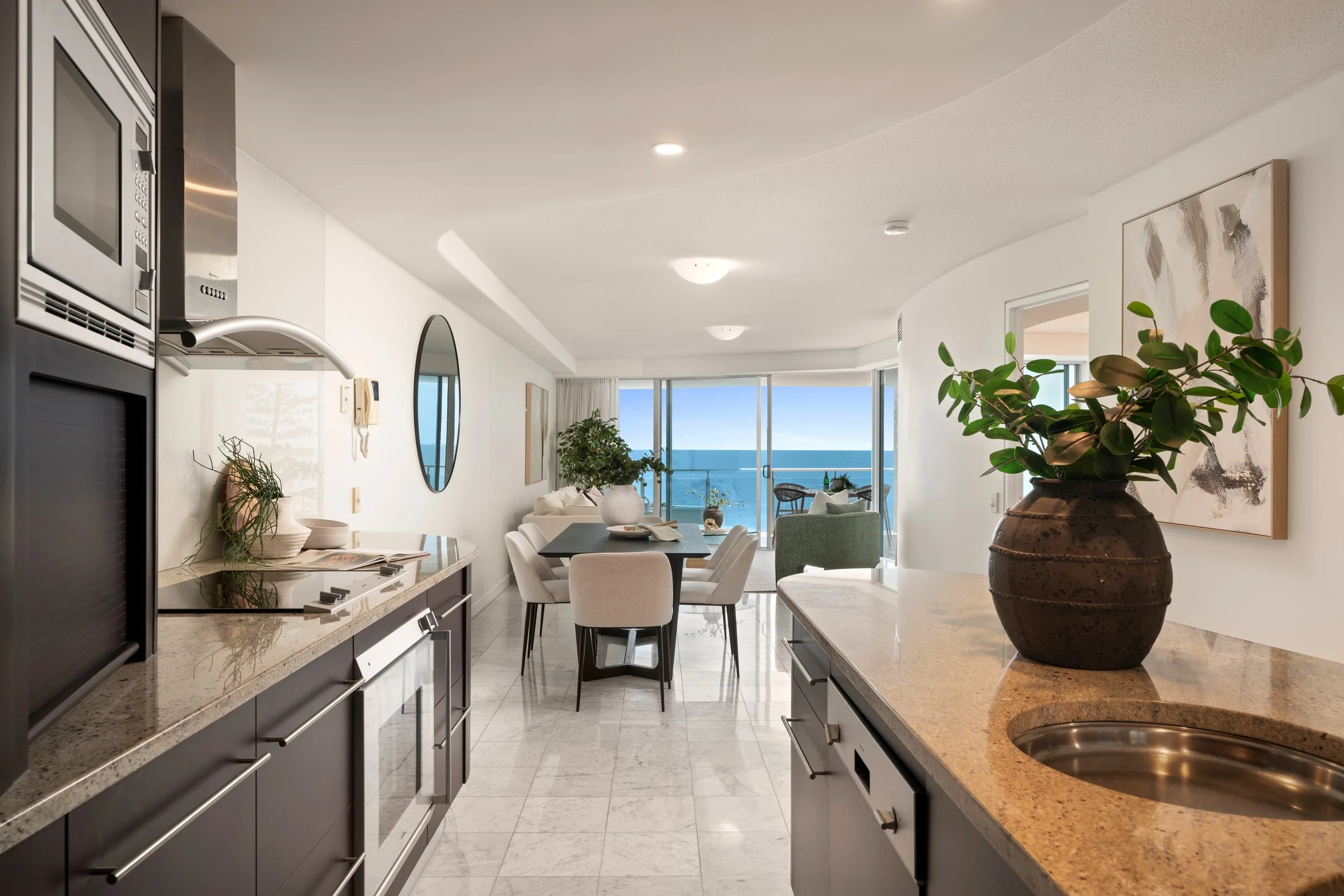The open-plan living, dining, and kitchen area unfolds seamlessly toward the balcony - an inviting space to entertain, unwind or simply take in the beauty of the coast. Here, uninterrupted views span from Pt Cartwright in the south, sweeping past Mt Coolum and reaching as far north as Noosa. From this fifth-level vantage point, every sunrise, surf break and golden afternoon becomes your own private masterpiece.