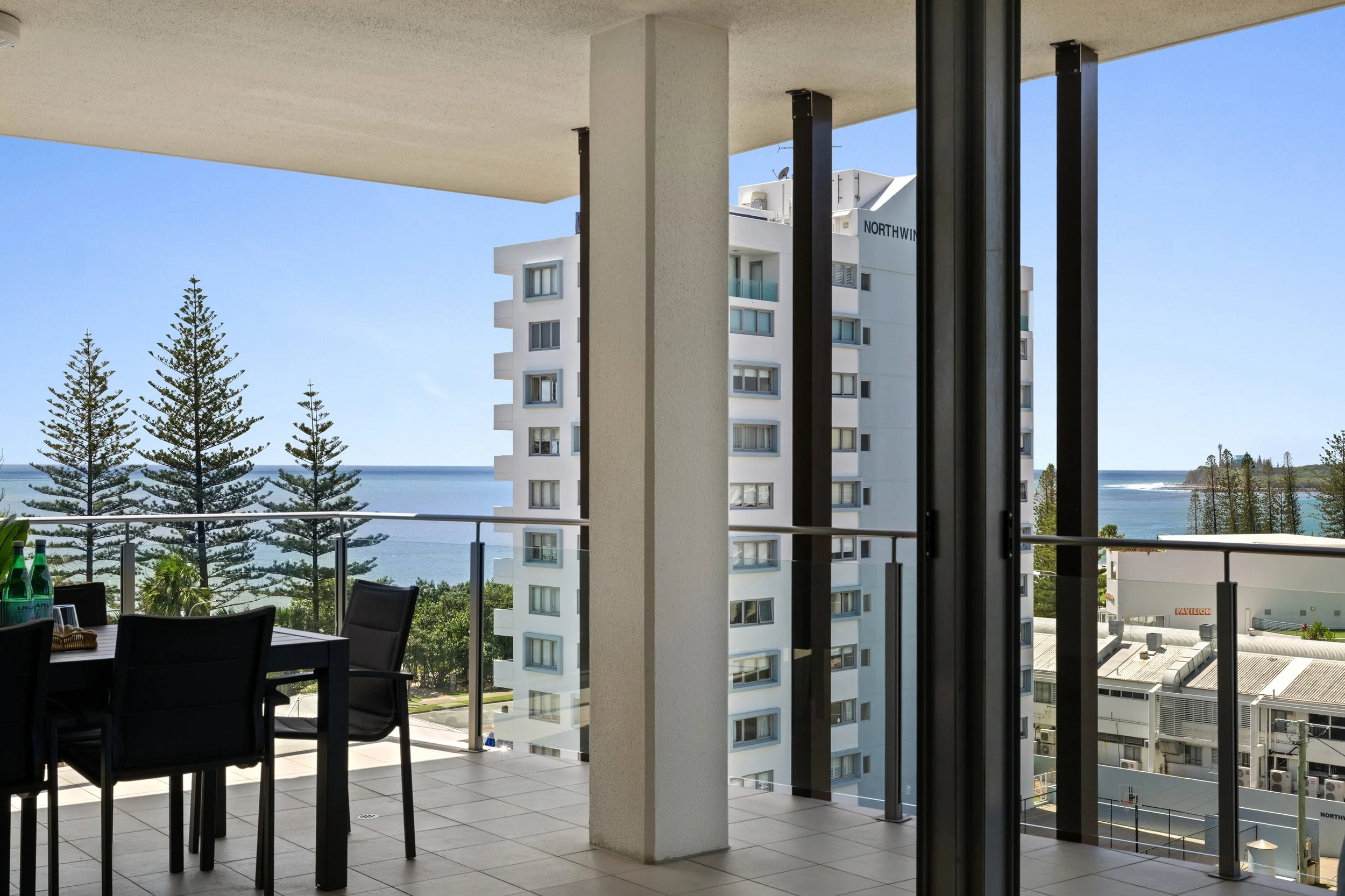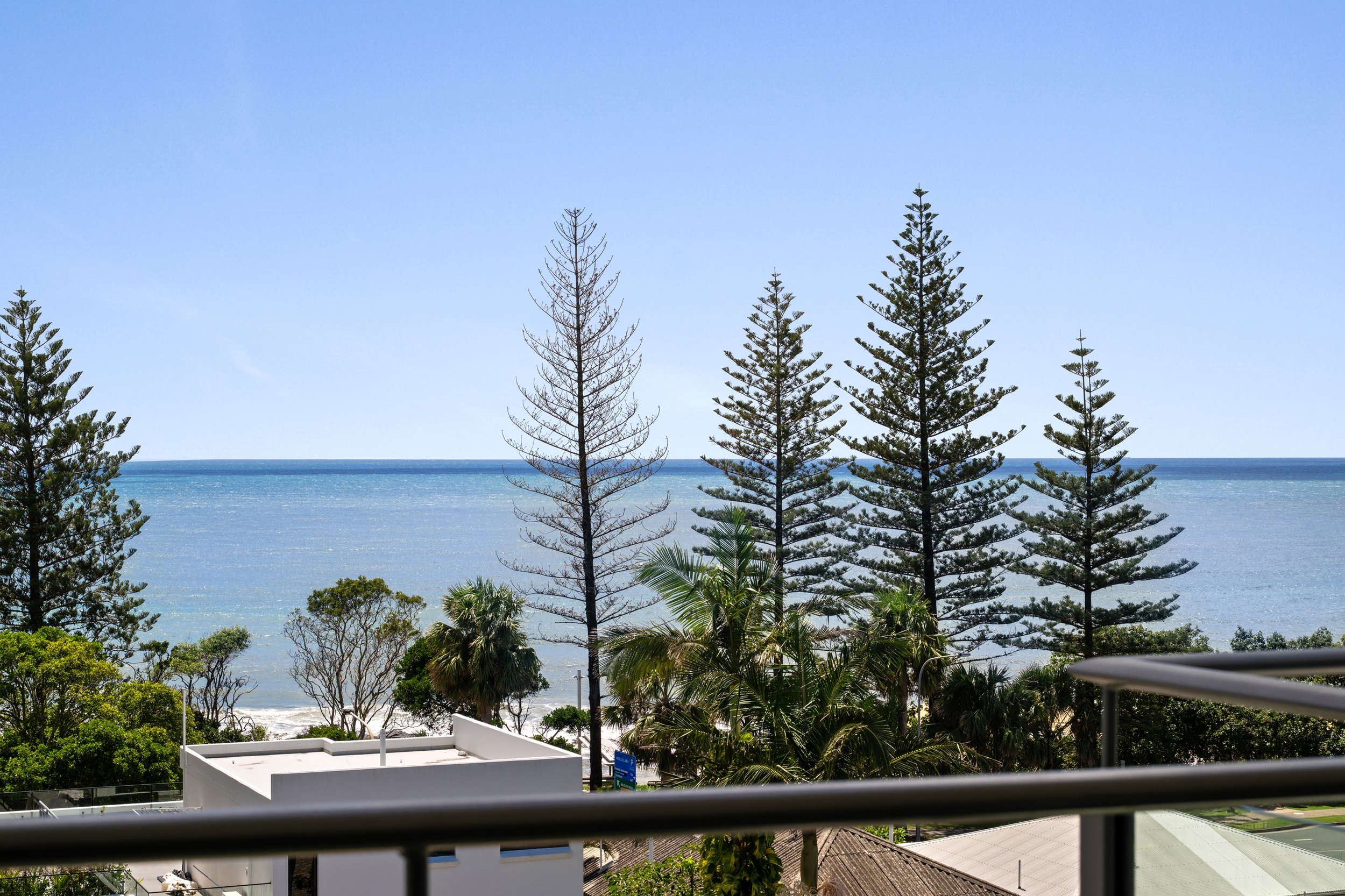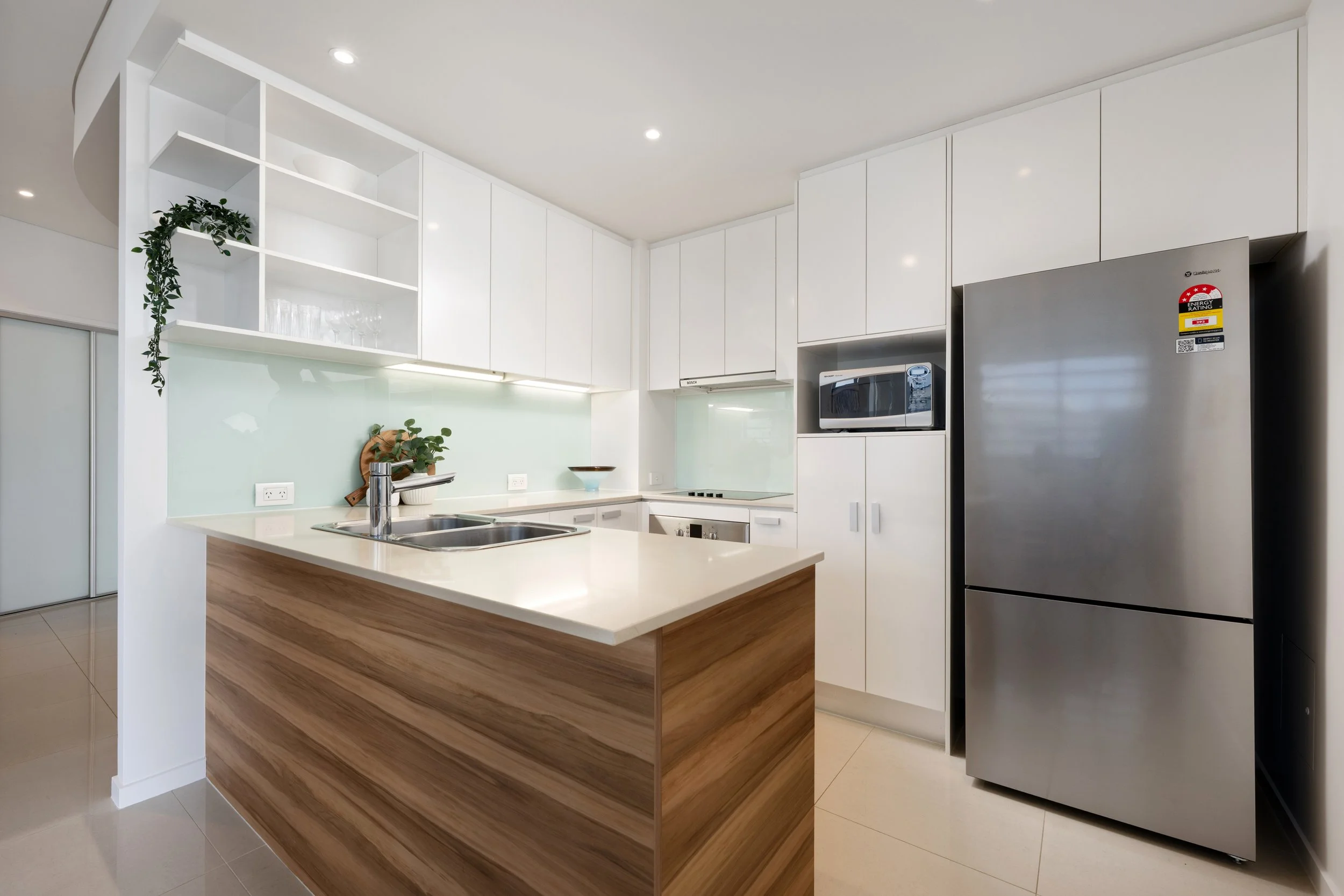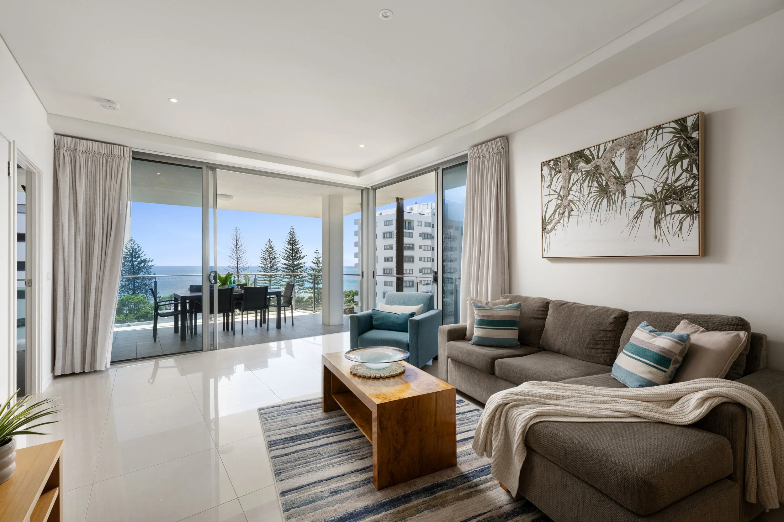 Positioned in the north-eastern corner of the building, the apartment benefits from additional windows along the side, allowing natural light to stream through the apartment and enhancing the spacious two-bedroom, two-bathroom layout while capturing refreshing coastal breezes. The open-plan living, dining and kitchen area flows seamlessly out to a generous balcony where you can enjoy ocean glimpses and hinterland views while taking in the ever-changing colours of the sky at sunset.